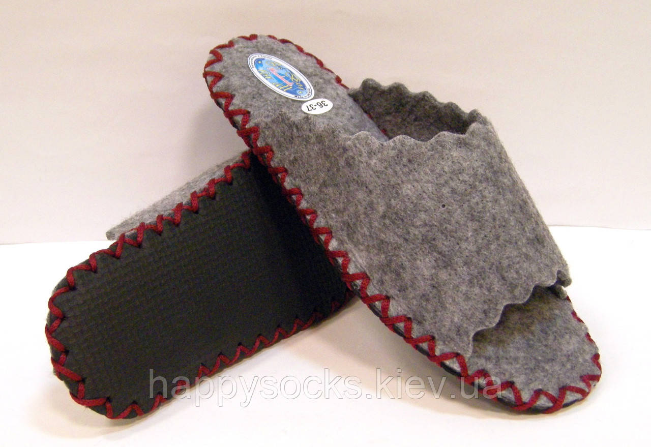Жіночі капці з повстяного фетру, сплетені синтетичним шнурком у ручну. Товстий шар повсті на устілці дає змогу капцям бути теплими. А прошарок, між устілкою та підошвою, зі щільного пінополіетилену робить м'якими та комфортними по всій довжині стопи. Уставлений так само підп'ятник імітує кабелі, завдяки чому немає відчуття завалювання на зад. Підошва зі спіненої гуми (ЕВА) завтовшки 3 мм.