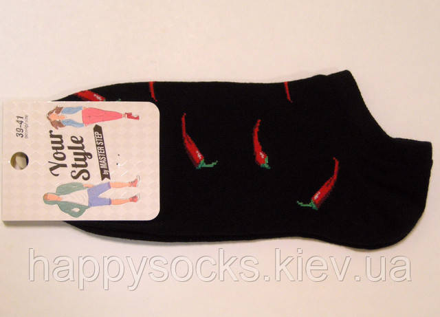 Низькі яскраві шкарпетки із зображенням гострих червоних перчиків. Шкарпетки виготовлені та з бавовняної пряжі європейського виробництва з додаванням італійського еластану. Мисок і п'ята посилені — це дає змогу збільшити зносостійкість продукту. М'який і еластичний трикотаж середньої щільності, добре тягнеться й не дає зсідання після прання.